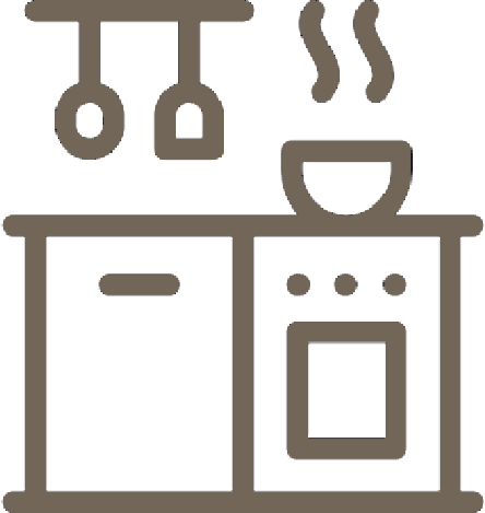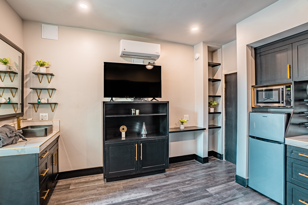 Studio apartments come in 3 categories ranging from a Full-Sized Studio to a King-Sized Studio, and are perfect for extended stays for one or two tenants. Each room is fully furnished with a fridge, microwave, electric stove, kitchenette, queen murphy bed, and 55” Smart TV. Decor is chic and modern, featuring black cupboards with gold trimmings and marble countertops. Shared washer and dryer are available for use and rooms are protected with Smart Lock electromechanical locks. Rent includes all utilities and TV service, and parking is available for an additional charge.